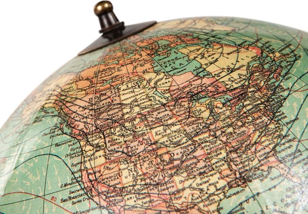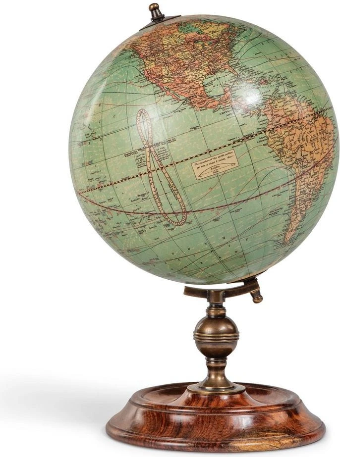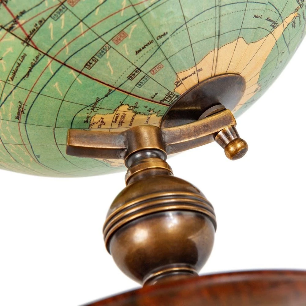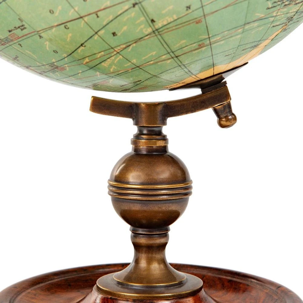 A contemporary classic. 1920s Weber Costello globe is displayed on ebonized wood stand accented bronze. Colored gores are applied to the globe core by hand with authentic construction and detail.The world in 1921. Roaring, yes…and still colonial.