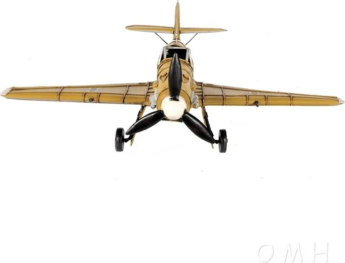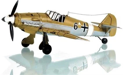The Messerschmitt Bf-109 was the dominant fighter during the opening stages of World War II and was the most produced German fighter of the war. It received many upgrades to its frame and armaments throughout its service. 109’s saw action in the Battle for Britain, North Africa campaign, Operation Barbarossa, the Spanish Civil war, and many others. This model is based off the most popular 109 the E variants and features the paint of the G series flown over North Africa. Features of this model include a rotating prop, mock wing cannons, full tin construction, and rotating gears. The model is one-twentieth the scale of the actual plane and is an excellent choice for placing on a table, shelf, or countertop.