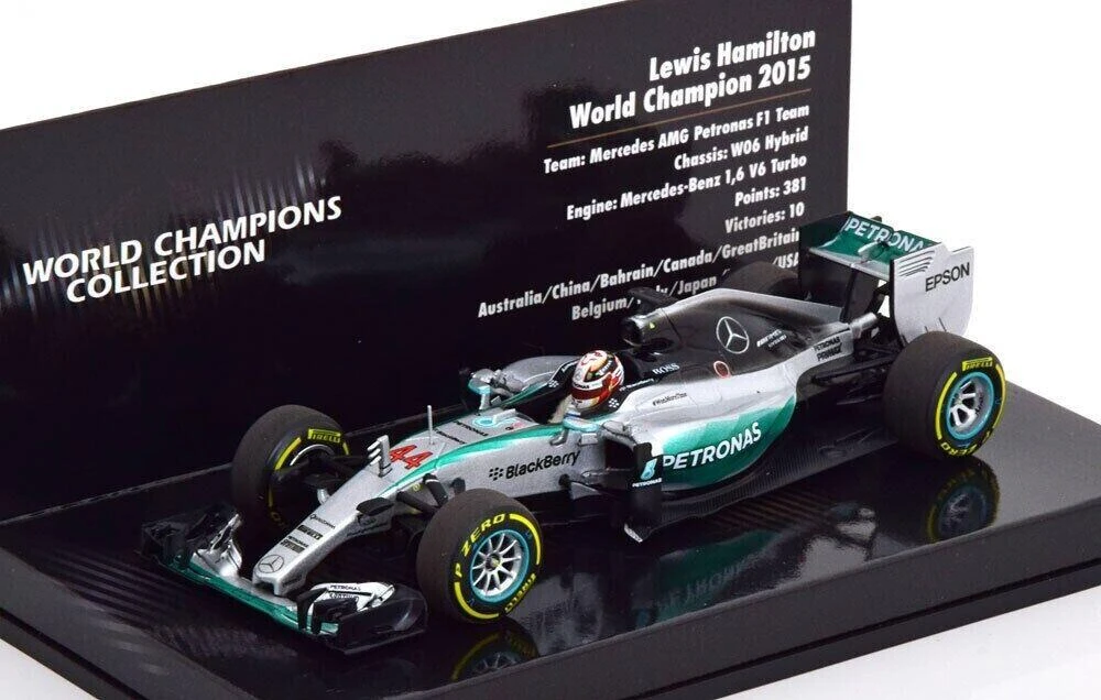 This is the 2015 Mercedes AMG Petronas F1 Team W06 Hybrid Lewis Hamilton in 1:43 scale by Minichamps.