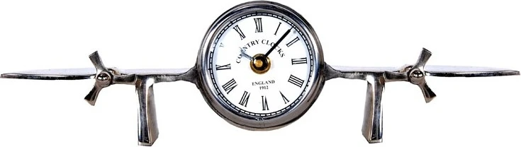 This unique aeroplane clock comes with the clock in the center of the wings. It features 100% hand-cast in solid aluminum and topped with a nickel-plated finish. The clock run with one AA battery (not included) and has a white face finish with Roman numerals numbers for a vintage look. Every detail on the model is hand polished to a high luster. This aeroplane clock is a perfect addition to any aviation enthusiast home or office!