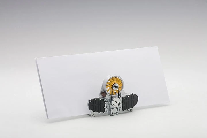 Designed to hold letters and small documents, the 911 Engine Letter Holder features a rubber belt linking the instantly recognizable cooling fan to the lower engine pulley, which can be spun together. Made mostly of finely die-cast metal, the rear mounting plate is a stainless-steel and photo-etched plate replicating the engine’s front face. It is attached to the back plate with two stainless-steel rods.