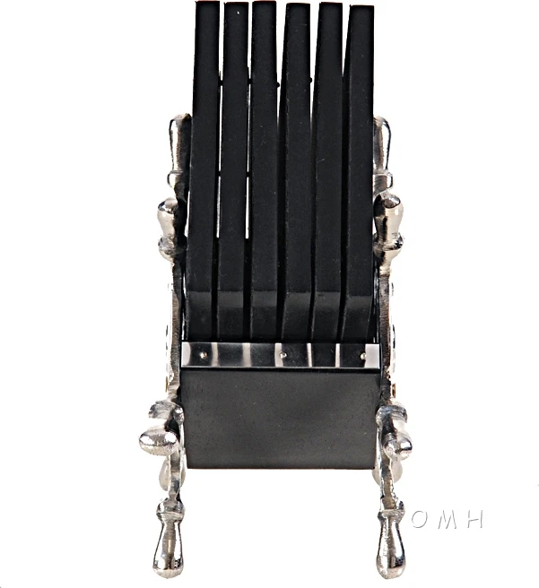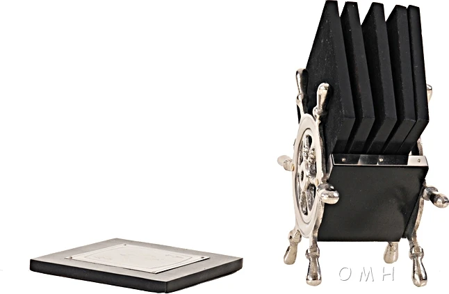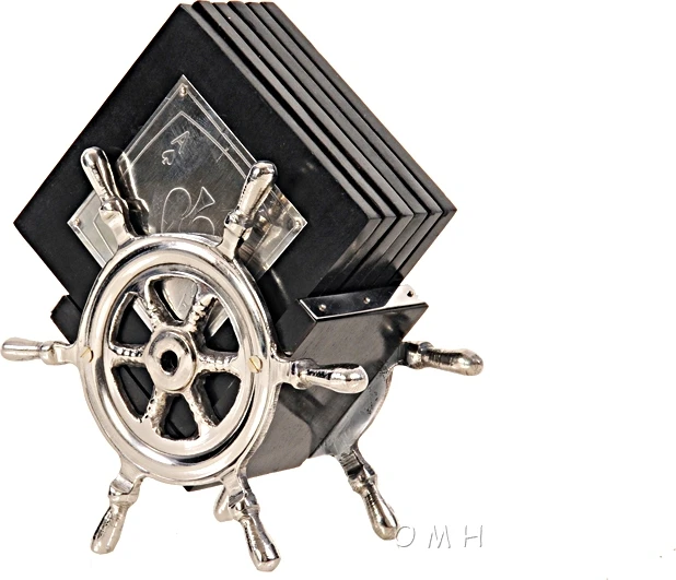 A five hand card game engraved in the aluminum of these coasters. Classic decor for the coffee table held within a pair of helms.