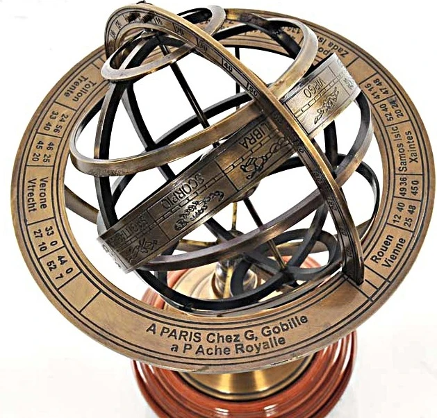This is a replica of a European Demonstrational Armillary Sphere. It was used to measure the relationships of the objects in the sky. Each piece is made of finely crafted brass. It consists of a set of graduated rings representing circles on the celestial sphere. The brass sphere at the center of the armillary represents the Earth. The rims are marked “A PARIS Chez G. Gobille a P Ache Royalle.” It features a rich antique finish that does not tarnish or show fingerprints. The heavy solid brass base is mounted on turned solid hardwood, and the bottom is covered with felt. Its a great addition to any nautical collection. The item dimensions are: L: 7 inches, W: 7 inches, H: 11.5.