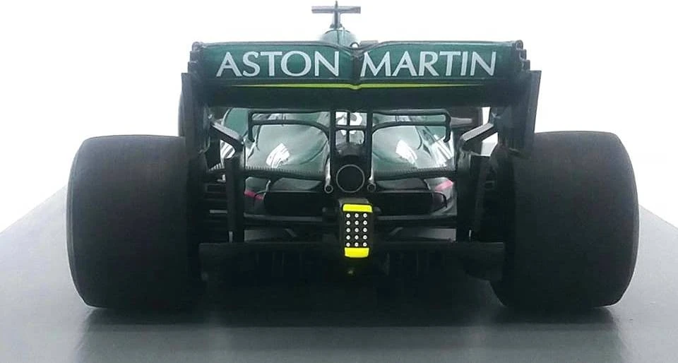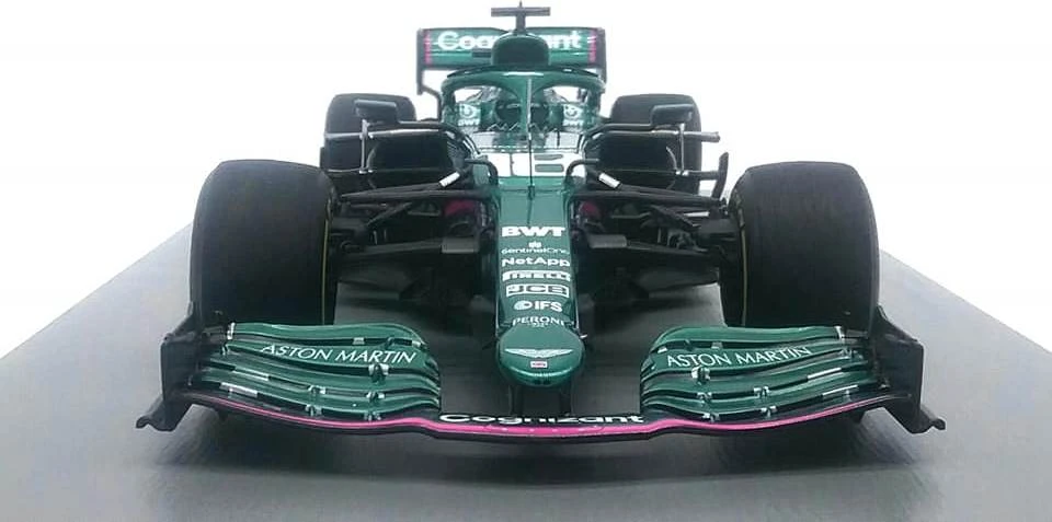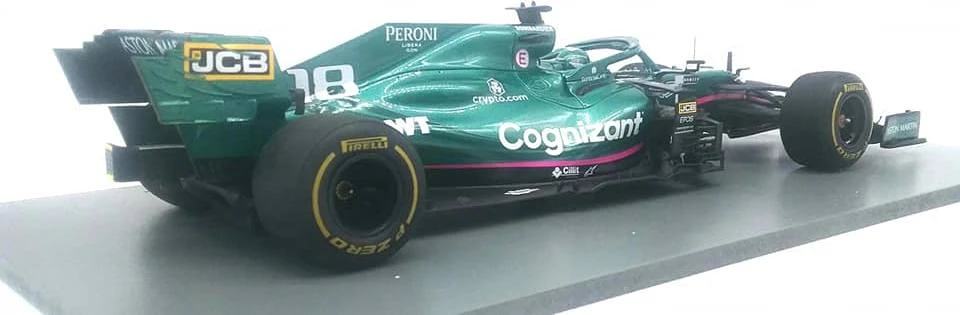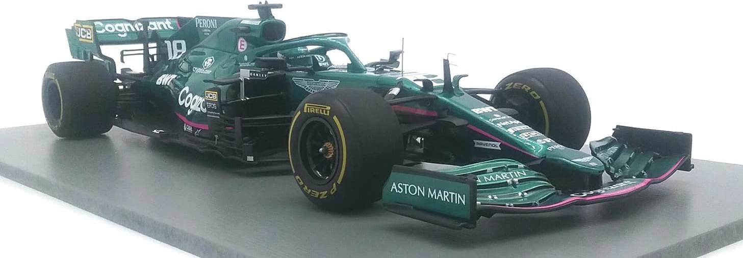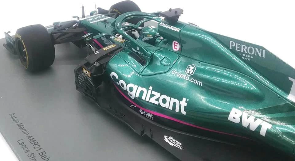 This is the ASTON MARTIN AMR21 NO.18 ASTON MARTIN COGNIZANT F1 TEAM BAHRAIN GP 2021 LANCE STROLL in 1:18 scale by Spark.
