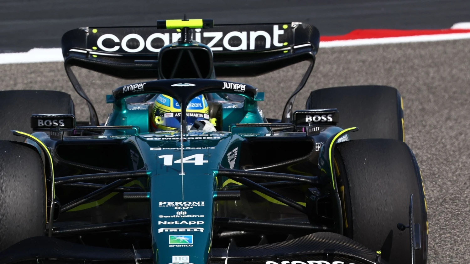This is the Aston Martin AMR23 No.14 Aramco Cognizant F1 Team3rd Bahrain GP 2023 Fernando Alonso in 1:18 scale by Spark.