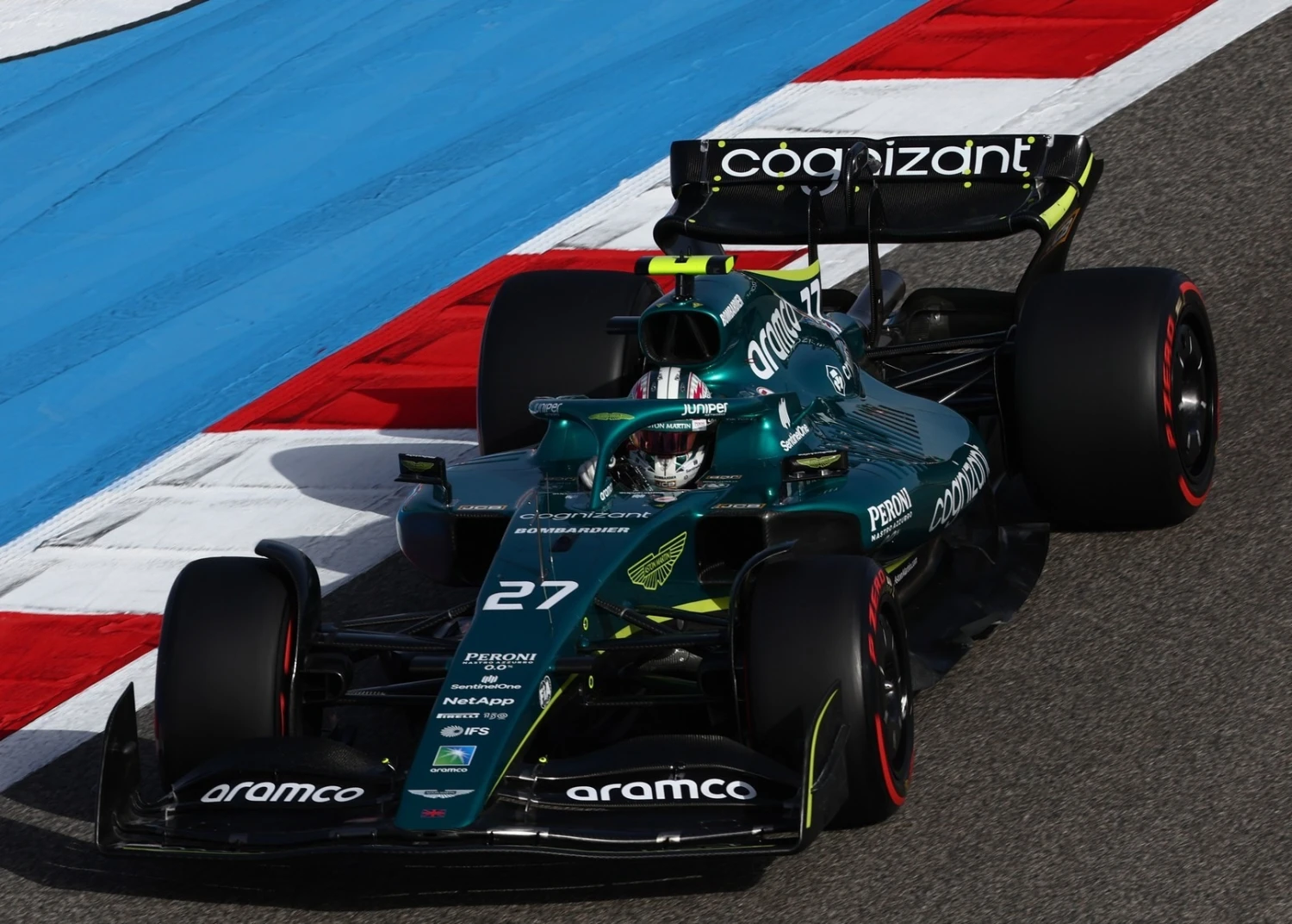 This is the ASTON MARTIN ARAMCO COGNIZANT FORMULA ONE TEAM AMR22 NICO HULKENBERG BAHRAIN GP 2022 in 1:43 scale by Minichamps.