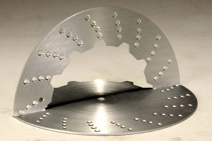 A pair of bookends made from two brake rotors bent at 90 degrees. The aluminium rotors are cross-drilled in the pattern of a high-performance brake disc. Note the hairline polished surface feature simulating the texture of brake marks on actual brake discs.