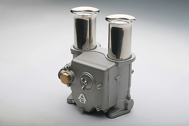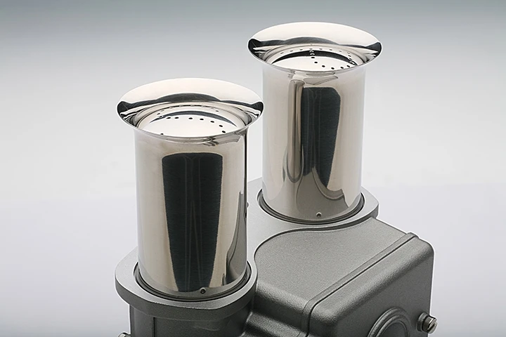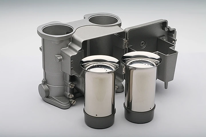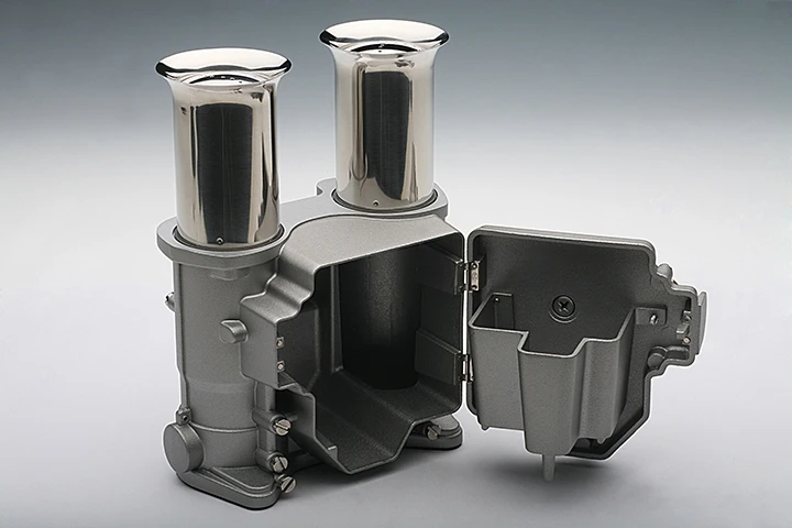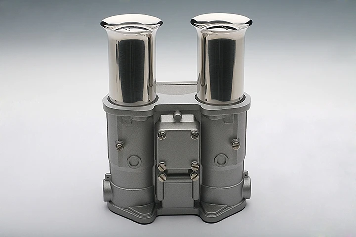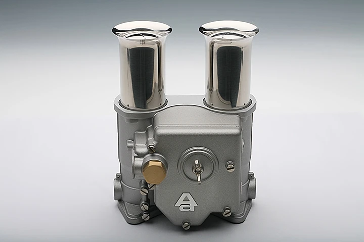 The aluminum side-draft carburetor body, reduced to 70% of its original size, is fitted with two removable stainless steel inlet rampipes that contain salt and pepper. The front panel swings open to reveal a compartment for sugar sachets and toothpicks.