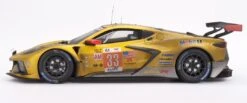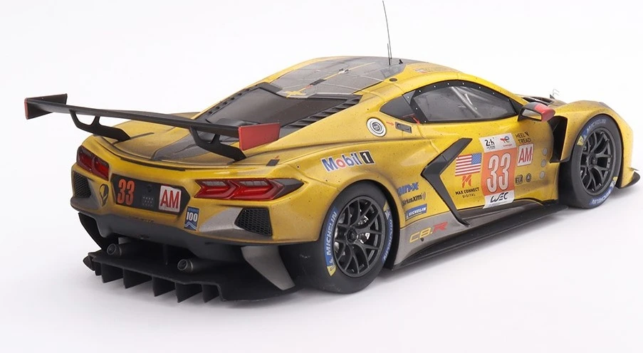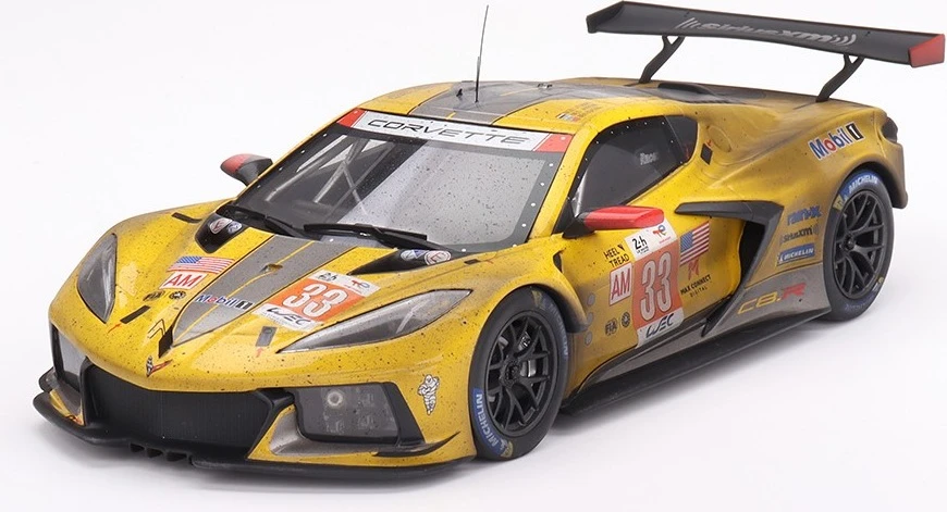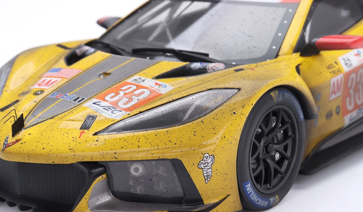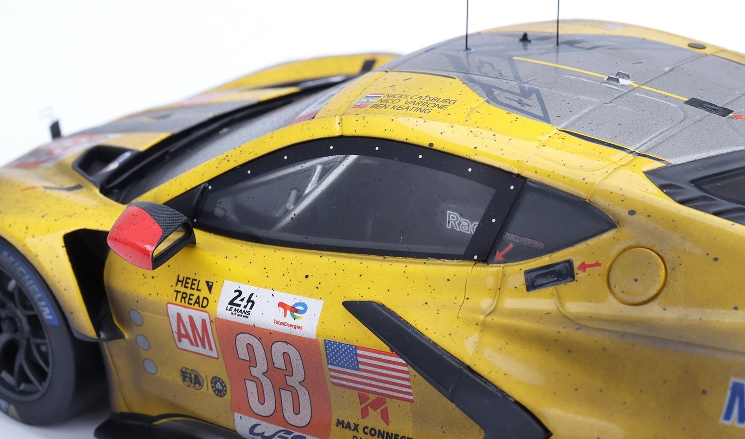 This is the Chevrolet Corvette C8.R #33 Corvette Racing 2023 Le Mans 24 Hrs LM GTE AM Class Winner Post-Race Weathered in 1:18 scale by Topspeed.