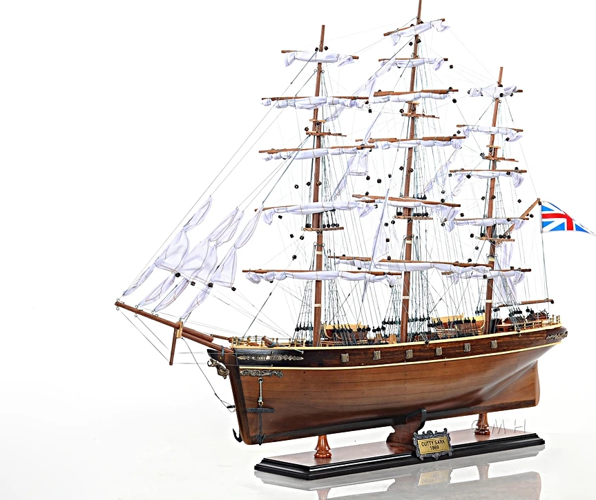 Display the only remaining original “Clipper Ship” from the 1800s designed by Hercules Linton right in your own home or office! The Cutty Sark, built in 1869 at Dumbarton, Scotland, is available as a FULLY ASSEMBLED model. Master craftsmen using historical photographs, drawings or original plans meticulously handcraft these highly detailed wood models from scratch. They are built to scale with high-grade wood such as: western red cedar, rosewood, and mahogany. They are 100% hand built individually using plank-on-frame construction method and are similar to the building of actual ships. Each model requires hundreds of hours to finish and must go through a demanding quality control process before leaving the workshop. The Cutty Sark model features plank on frame, two decks, and one row of metal portholes on each side of the ship. The front bowsprit and three large masts are connected securely using advanced rigging and lines painstakingly knotted and fastened by hand. Each yard has an attached hand-stitched rolled-up sails made of fine linen. Metal anchors and a wooden rudder are visible on the front and rear of the ship. On the deck, there are authentic hand-built lifeboats with ribs and planks, metal steering wheels, wood ladders and windlass, captain’s dining and sleeping cabin, and many other handcrafted ornaments. This model comes standard with a solid wood base and brass nameplate. It’ll make a perfect gift for home or office decorator, boat enthusiast or passionate collector.