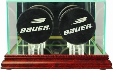This Double Puck display case comes with mirror on the bottom and back to give a full view of your autogrphed baseballs. This case is UV protected and is supported by real wood moulding. Our adhesives contain no acids that may deteriorate signatures. This display case comes with two acrylic Puck holders.
