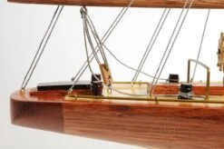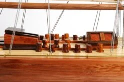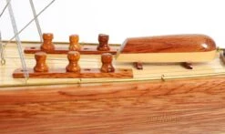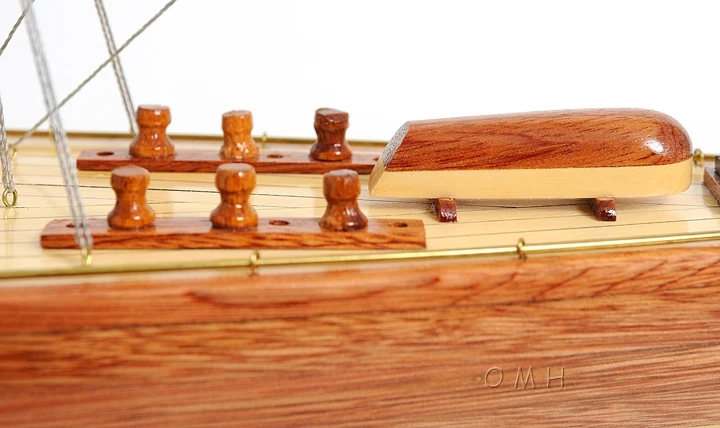 The Endeavour model features beautiful hand stitched sails that extends all the way to the masthead. The wooden pulleys keep the complicated rigging tighten. The deck is made out of wood planks that are carefully pieced symmetrically for a beautiful finish. An elongated boom flows from the mast to the stern. There is a wooden cabin located in the middle of the deck. You can also spot a companionway that would lead to the bottom hull. Various wooden winches are placed around the deck to wind up or let out riggings when needed.