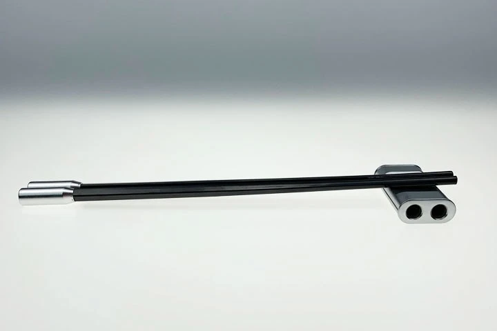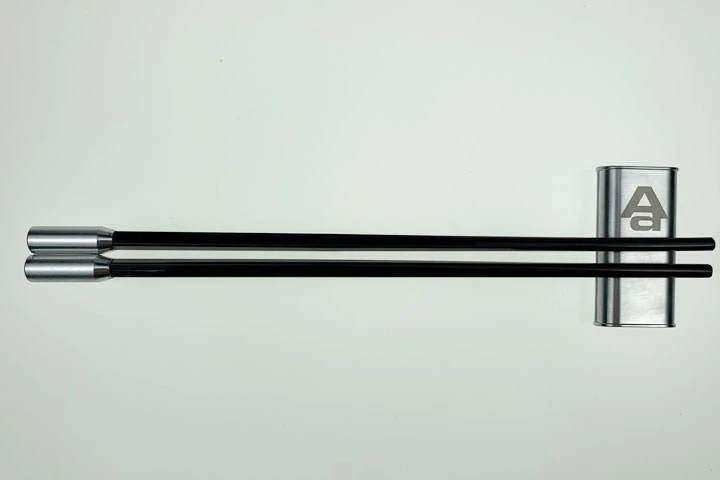 Appearing like a miniature exhaust system, the two exhaust pipes function as a pair of chopsticks when taken out from the muffler. The muffler itself is placed on the table as a chopstick rest. The chopsticks are made of special plastic that is hygienically safe and the exhaust tips and muffler body are made of aluminium.
