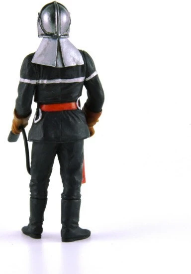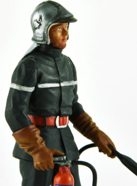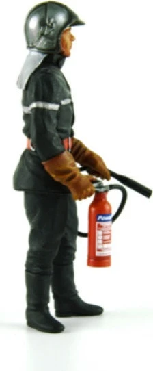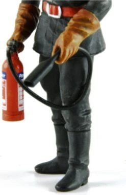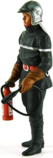 Fireman figurine with full suit gloves and helmet and holding a fire extinguisher