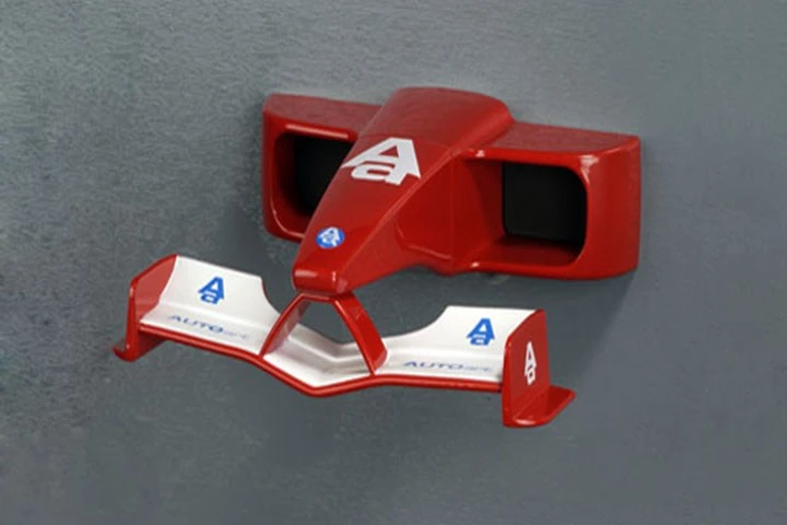 Open-wheeler, formula racing is an internationally renowned event that involves both great speed and driving skills. All racing teams carry several spare Formula noses that are lined up in their trackside garages to promote their livery designs. Replicating the Formula nose to a scale of 1:10, this item serves as a wall-mounted clothes hook for jackets, ties or even umbrellas. Alternatively, it can be placed simply as a decorative art piece reflecting your passion for Formula racing. It is robustly made of die-cast metal with two mounting screws supplied.