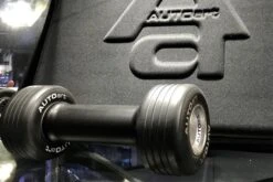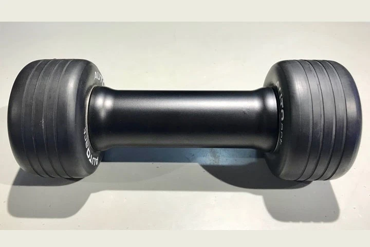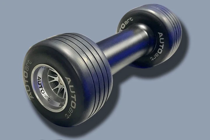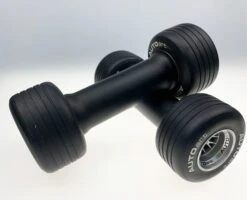 A dumb-bell made from a pair of 1:8 scale Formula 1 wheels mounted with real rubberised tyres and connected to a solid steel handle bar coated in black paint. It weights 2.2 kg. The soft rubberised tyres serve to protest the dumb-bell from damaging the floor if dropped accidentally.