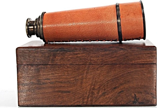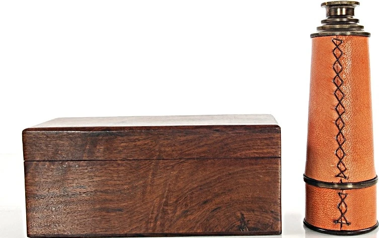 This hand held telescope is made of high quality brass. Each component is crafted with the finest craftsmanship. It comes with antique looking leather overlay that provides a rugged look and feel. Its available in antique brass finish and comes with a rosewood gift box. This is a great item to use and add to any nautical collection. The item dimensions are: L: 16 inches extended, W: 2.25, H: 2.25 inches.