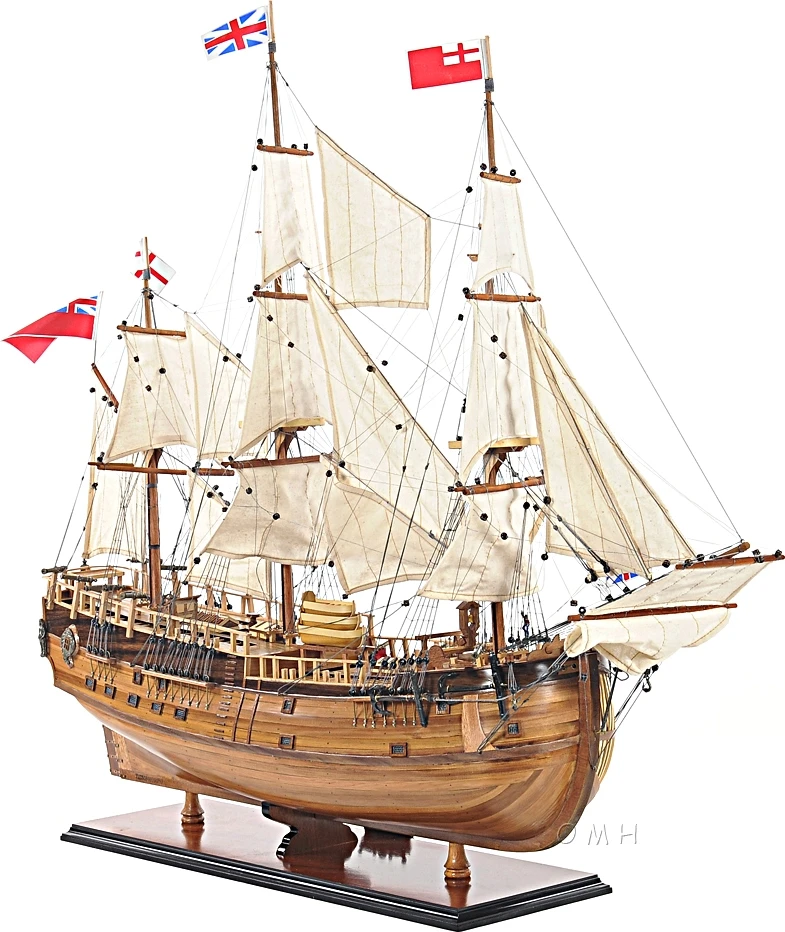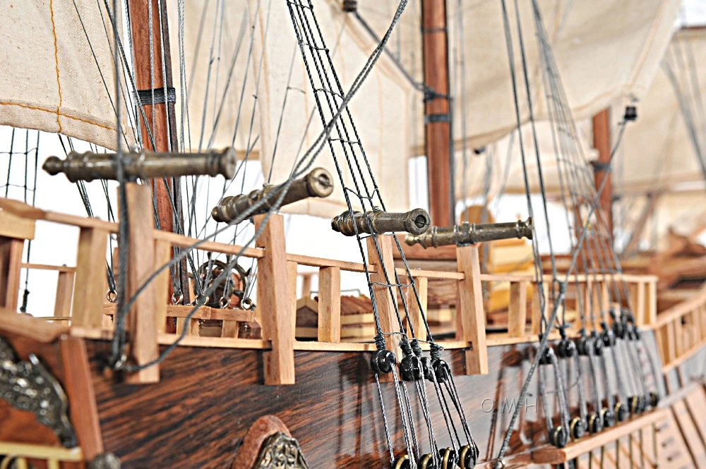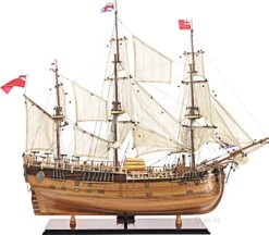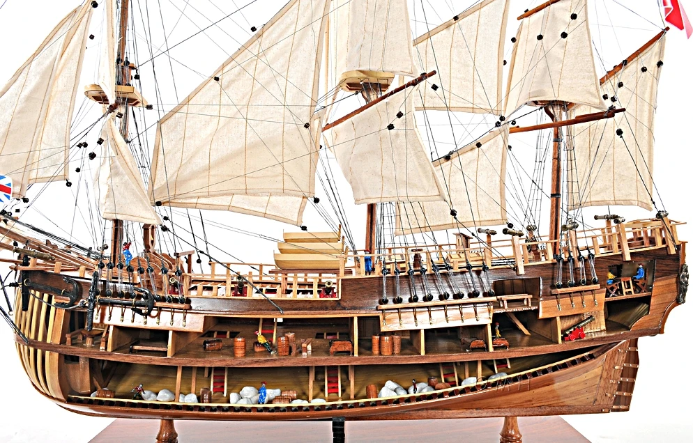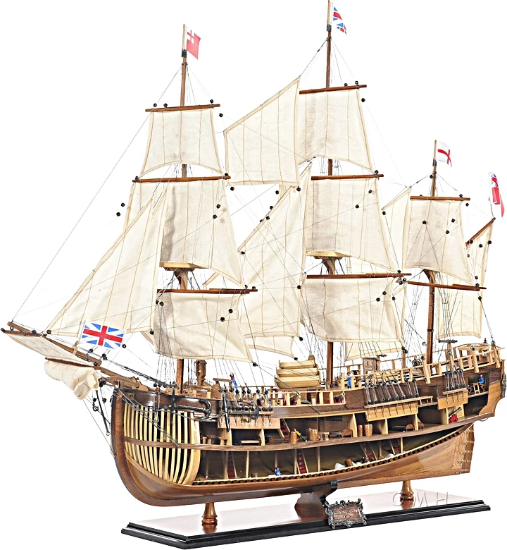 To recapture the beauty of the real ship into the model, we have used the most exotic wood that are available, the highest quality brass fittings that we can cast and more than 200 hours to put together this magnificent model. Examples of wood use include rosewood, western red cedar and mahogany. These materials are transformed into art pieces by the skillful hand of the master craftsmen. If you look closer, you can see an evenly smooth surface of wood on the hull. It was done more beautifully then most pieces of fine furniture. Looking through the open hull, you can see furniture, painted service men, drums, stair cases, door which are all finished in great details. The art of wood working is quite impressive on the hull & decks. Other magnificent details include metal sculptures, brass canons and anchors, wooden life boats and sky light… The model comes with its original British Royal Navy flag and rest on a steady wooden base with attached metal name plate. 100% assemble, ready for display.