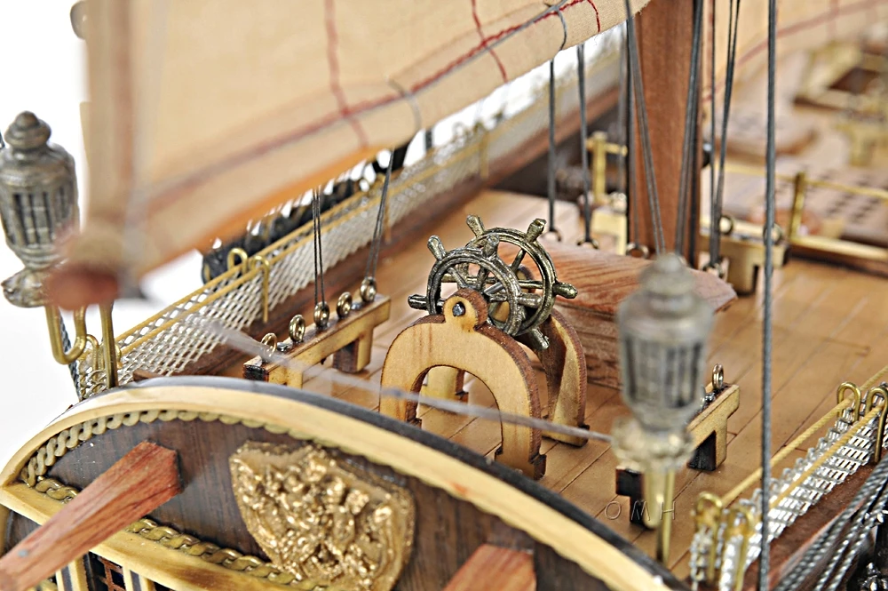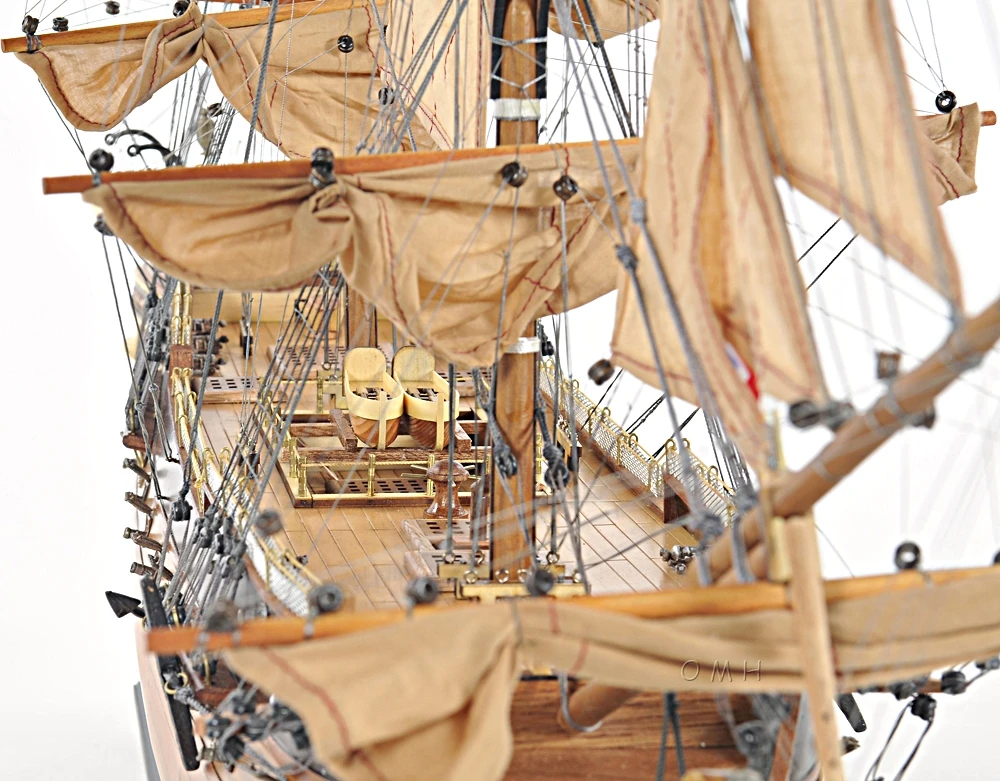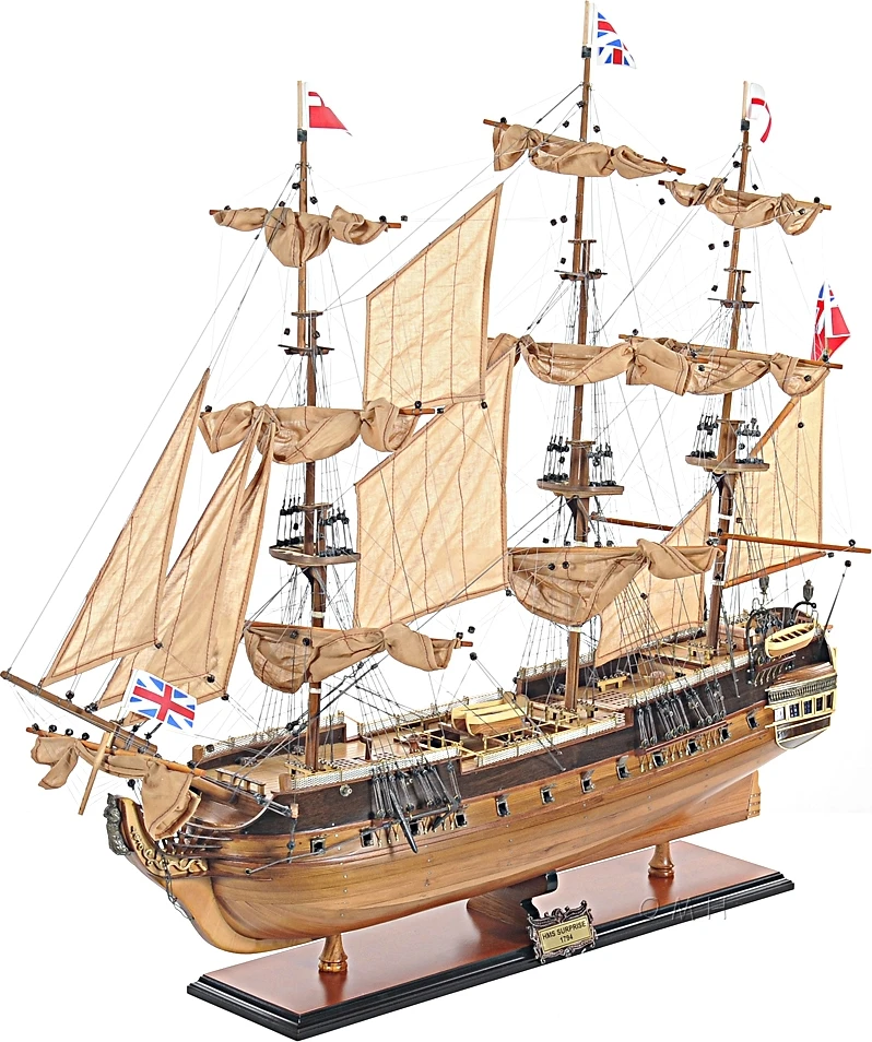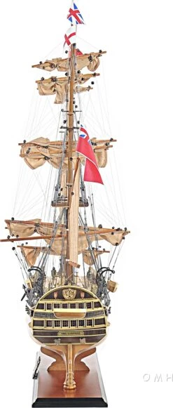 Our spectacular HMS Surprise model is handcrafted from beautiful wood such as rosewood, mahogany, teak, and along with various other exotic wood. The hull is constructed using a plank on frame method, each strip of exotic wood are carefully join together to form a smooth hull. This model is completely hand built to spec by skillful and creative master craftsmen; you will be amazed at how real it looks. The ship has a clear varnished coating follow with amazing details. On the ship, you can come across incredible features such as: wooden bowsprit, foremast, mainmast, and mizzen mast. They are all connected to numerous full-size fabric sails with detailed stitching, all rigging are painstakingly fastened by hand in matching colors. On the main deck, you will come across 2 wooden boats situated in a large rectangular area with 2 wooden bunkers, a wooden/metal steering wheel, and a wooden bunker with a telescope. On the poop deck, there’s navigational area with 2 metal steering wheels for the captain and 1 wooden cabin. There are metal railings surrounding the beakdeck area toward the quarter deck area. You can easily spot 2 rows of numerous metal cannons on both side of the hull. In addition, you will find supplementary crafted metal parts on the ship such as: anchors, lantern, statues, and much more…There’s also a wooden rudder held with metal to help the ship maneuver in the right direction. An attached wooden stand with a nameplate engraved “HMS Surprise 1794” is standard on this model. Our model was built according to scale through original plans, pictures and drawings. We absolutely use no plastic parts only the highest quality wood and metal parts. This model is carefully secure and packed inside a wooden crate for easy shipping purposes. Our HMS Surprise model comes fully-assembled and ready to be display.