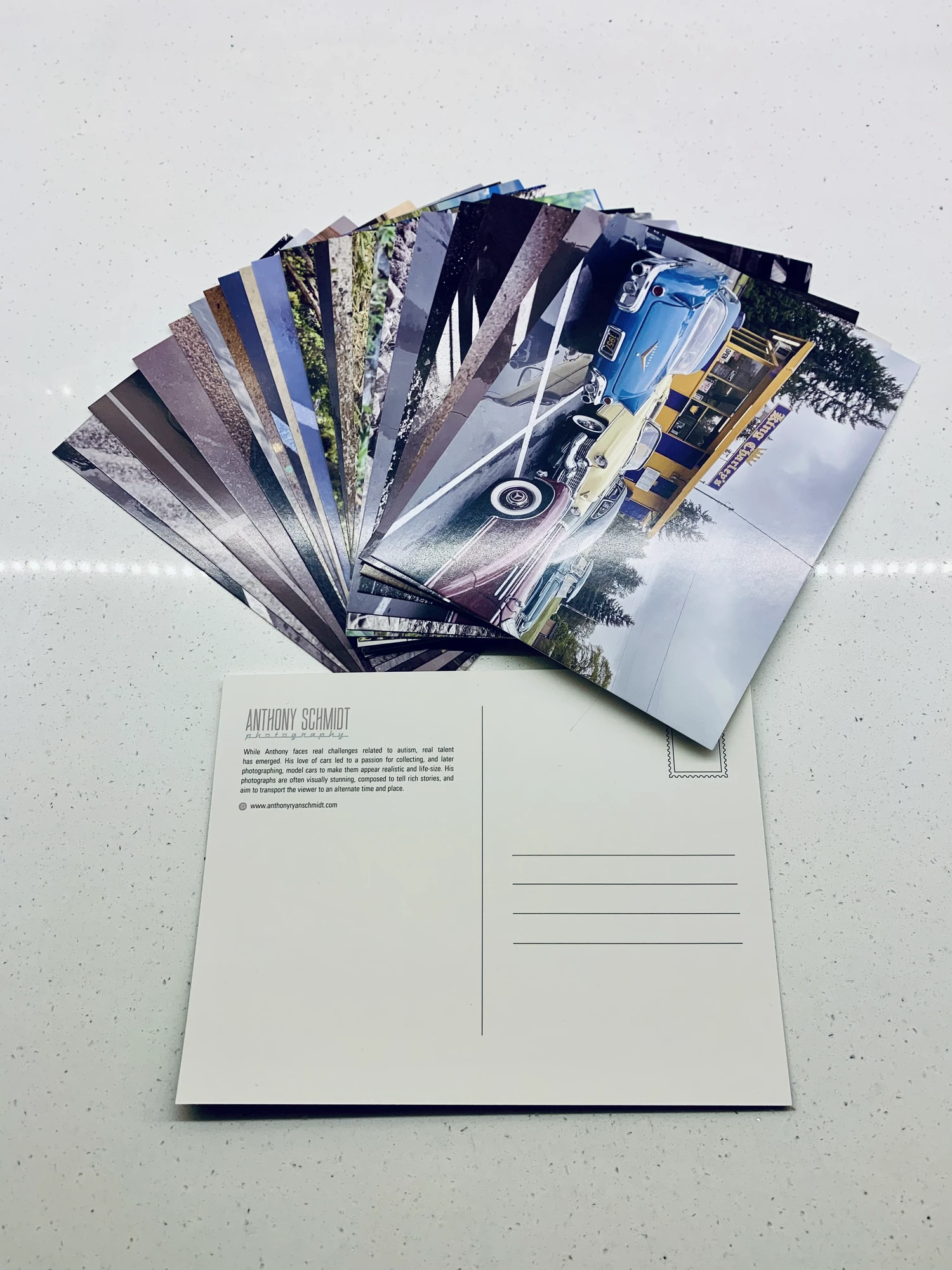 “A beautifully packaged collection of 24 postcards featuring Anthony’s photography. Great for all occasions!”