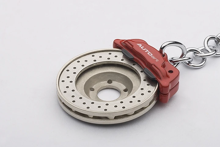 Designed after a performance oriented brake disc found on some higher end luxury and sport cars, this die-cast metal 3 cm (1.2”) miniature brake disc keychain features a rotor that actually rotates within the brake caliper. The rotor surfaces are fitted with photo-etched stainless steel plates that have been manually brushed to simulate hairline braking marks.