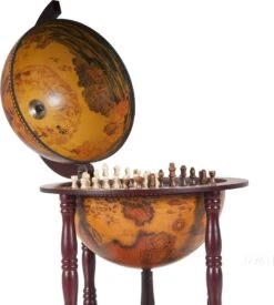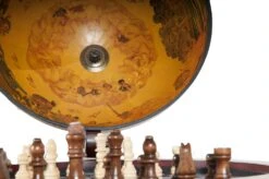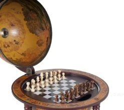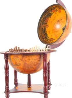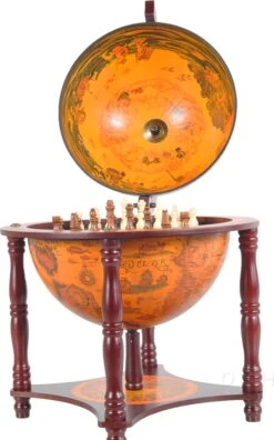 Beautiful globe mounted on a clean elegant stand. Features a nautical map on the exterior. Mythology inspired oceanic themed art cover the inner globes upper half. All of which center around a chess board that is placed within the globe. It makes the perfect edition to a home whether it be placed on a table, bookshelf, desk, or anywhere else. This is a perfect gift for anyone who wants a globe, unique chess board, or is moving into a new home.