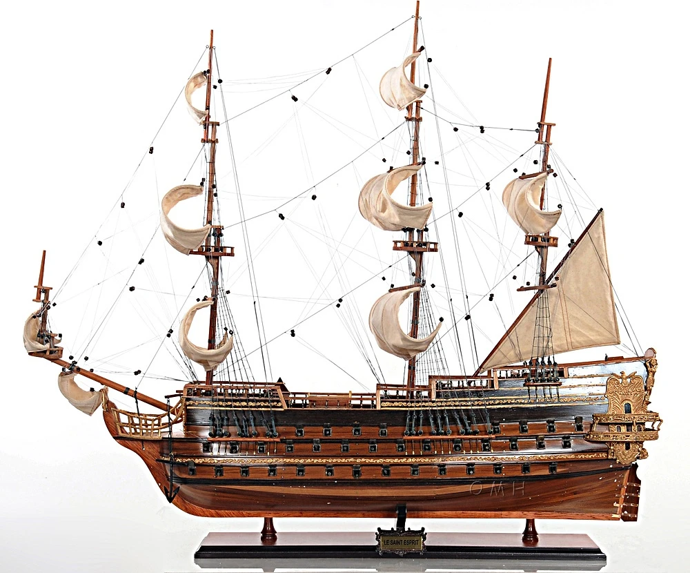 This is a high quality FULLY ASSEMBLED “Holy Ghost”, the 80-gun ship of the line of the French Navy, lead ship of her class. The Saint Esprit was offered by the Order of the Holy Spirit, and named in its honour. This is an “Exclusive Edition” where the model has a unique serial number etched into the hull, which allows us to identify production date, material used and all other production information of a model. Master craftsmen using historical photographs, drawings or original plans meticulously handcraft these highly detailed wood models from scratch. They are built to scale with high-grade wood such as: western red cedar, rosewood, and mahogany. They are 100% hand built individually using plank-on-frame construction method and are similar to the building of actual ships. Each model requires hundreds of hours to finish and must go through a demanding quality control process before leaving the workshop. This beautiful Saint Esprit model features plank on frame, three decks, and three rows of ferocious cannons on each side of the hull. A unique bowsprit design that consists of metal statue and side railings coated in gold color. The front bowsprit and three large masts are connected securely using advanced rigging and lines painstakingly knotted and fastened by hand. Each yard has an attached hand-stitched unfurled sails made of fine linen. Metal anchors and a wooden rudder are visible on the front and rear of the ship. On the deck, there are metal stationed cannons, authentic hand-built lifeboats with ribs and planks, wooden windlass, wooden cabin, wooden bell tower, metal steering wheel, and many other spectacular ornaments. There is also an exquisite detailed admiral’s quarter on the stern with beautiful handcrafted brass statues and ornaments. This model comes standard with a solid wood base and brass nameplate. It’ll make a perfect gift for home or office decorator, boat enthusiast or passionate collector.