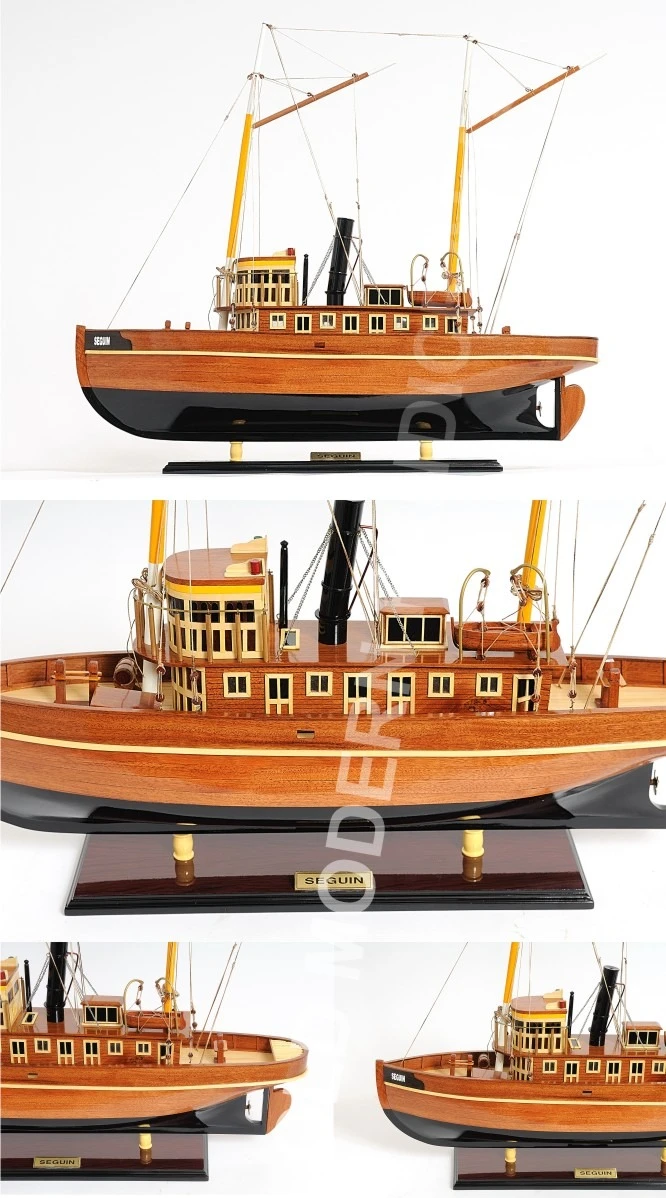 This is a great model of Seguin tug boat. It was all handmade by strips of mahogany and teak. All built plank on frame. Look at all the amazing details on the windows and deck area. All the little pieces of wood are glued together in tremendous amount of time. The masts and the smoke stack and the lower portion of the hull are painted in the original colors. It has a shiny finish that make this model looks very beautiful. The craftsmen must have spent over a hundred hours with this.