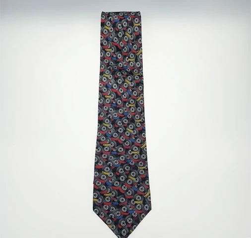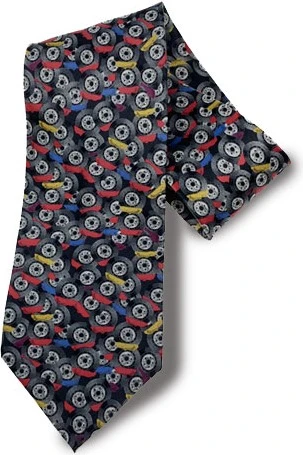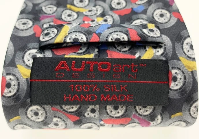 These 100% silk ties are handmade and screen printed with patterns of colourful brake disc calipers.