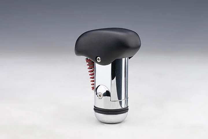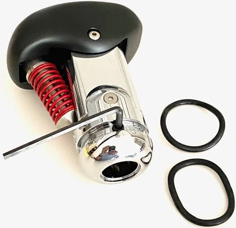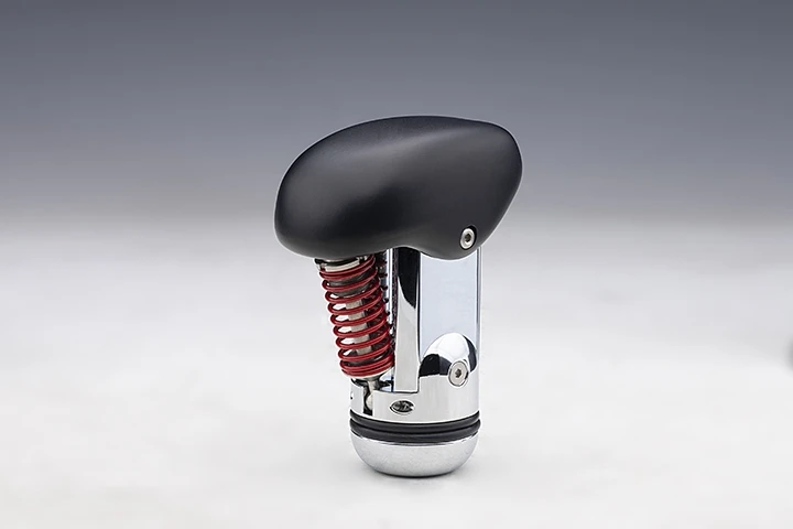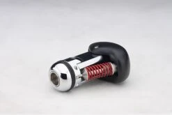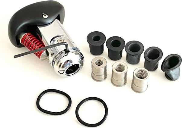 When shifting gear in a fast and furious way, the shock absorber with spring fitted in the gear knob dome tilts to cushion the palm. The main body of this unit is made of billet cut and machined aluminum then mirror polished. The dome is die cast aluminum coated with black paint. It comes with 3 sizes of threaded stainless steel adaptors and 5 rubber bushing to fit most car models fitted with a stick shift and secured by 3 small Allen head screws concealed with two rubber O-rings.