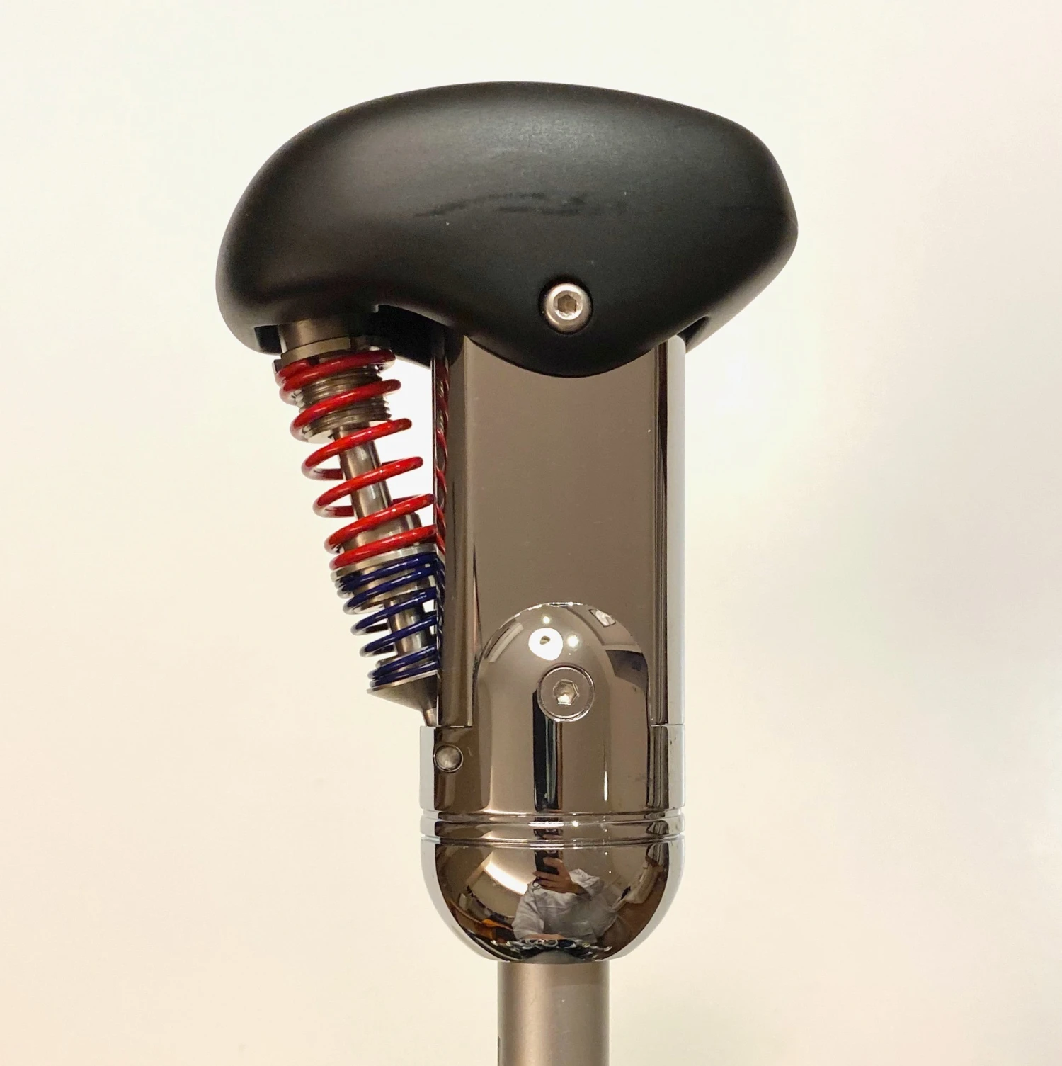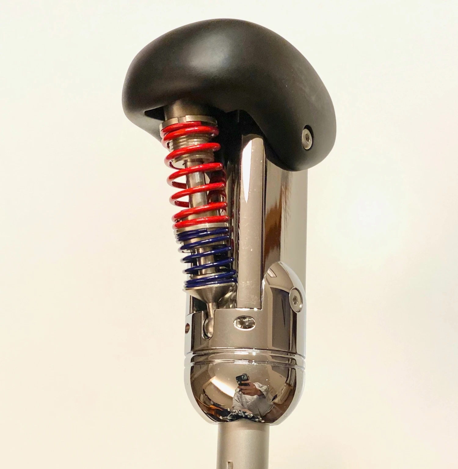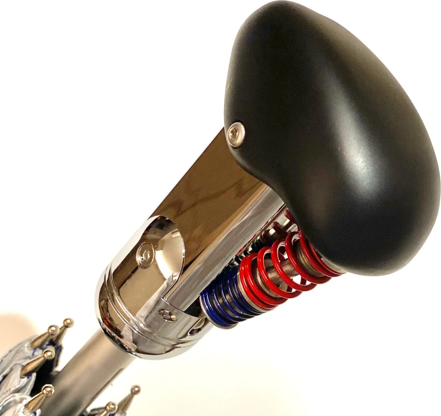 This umbrella has a handle incorporating a mini racing style damper with dual spring compression rate. The handle is made of billet cut and machined aluminium. Pressing the aluminium black-coated dome suspended with a mini damper actuates the opening of the umbrella. The tip is CNC machine cut aluminium simulating the centre-lock nut of a racing wheel. It can be detached and installed on a manual shift car.