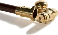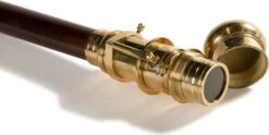 A cleverly engineered mechanism allows the telescope to be pulled up and swiveled. Held up by the stick it can be aimed and pointed like a monocle which magnifies threefold.