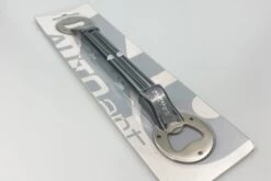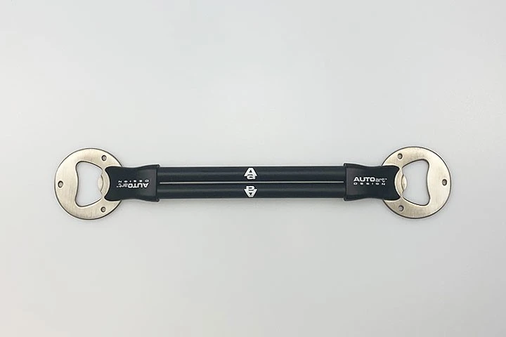 A strut brace is used to support the upper tower of a car’s suspension in order to limit the movement during hard cornering, a feature usually found only in high-performance sports cars and racing cars. This miniaturized strut brace has slots at both ends that function as bottle openers. It is fabricated with high quality solid stainless steel.