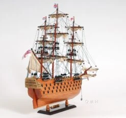 Our HMS Victory model is a smaller scale version of a much larger version such as the HMS Victory 36” and the 56”. Our model is handcrafted from beautiful wood such as rosewood, mahogany, teak, and along with various other exotic wood. The hull is constructed using a plank on frame method, each strip of exotic wood are carefully join together to form a smooth hull. This model is completely hand built to spec by skillful and creative master craftsmen; you will be amazed at how real it looks. The ship has a clear varnished coating follow with amazing details. On the ship, you will spot amazing details such as: wooden bowsprit, foremast, mainmast, and mizzen mast. They are all connected to numerous fabric sails with detailed stitching, all rigging are painstakingly fastened by hand in matching colors. There’s a small wooden cabin with a wooden boat on the main deck. On the quarter deck, there’s a wooden cabin. There are wooden fences surrounding the beakdeck area toward the quarter deck area. You can easily spot a large number of metal cannons on both side of the hull, and other crafted metal parts on the front and back of the ship. There’s also a wooden rudder to help the ship maneuver in the right direction. An attached wooden stand with a nameplate engraved “HMS Victory 1805” is standard on this model. Our model was built according to scale through original plans, pictures and drawings. We absolutely use no plastic parts only the highest quality wood and metal parts. This model is carefully secure and packed inside a wooden crate for easy shipping purposes. Our HMS Victory model comes fully-assembled and ready to be display.