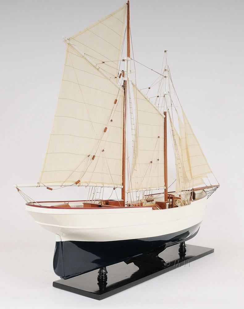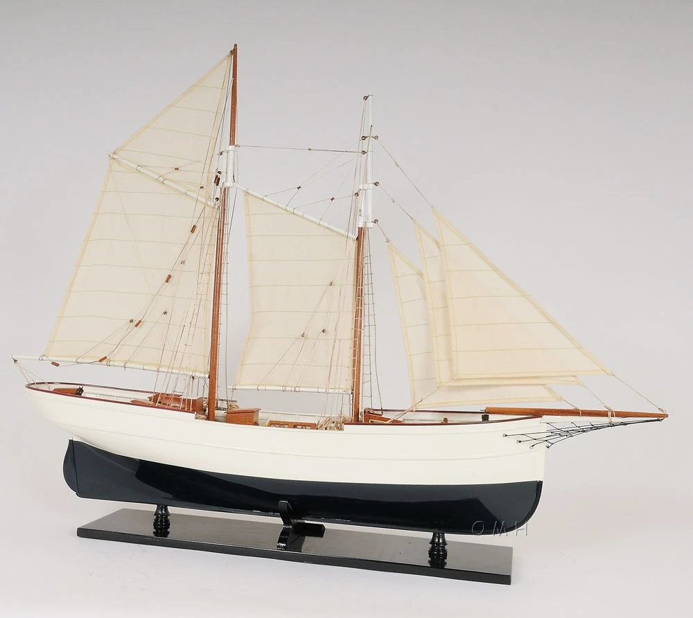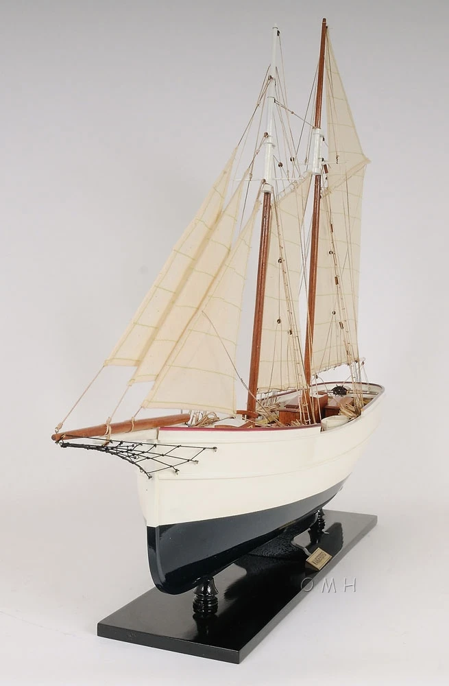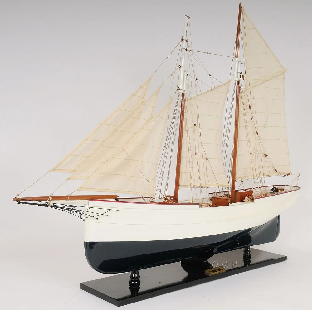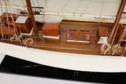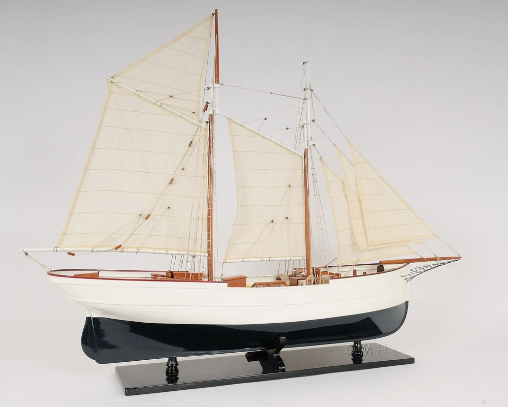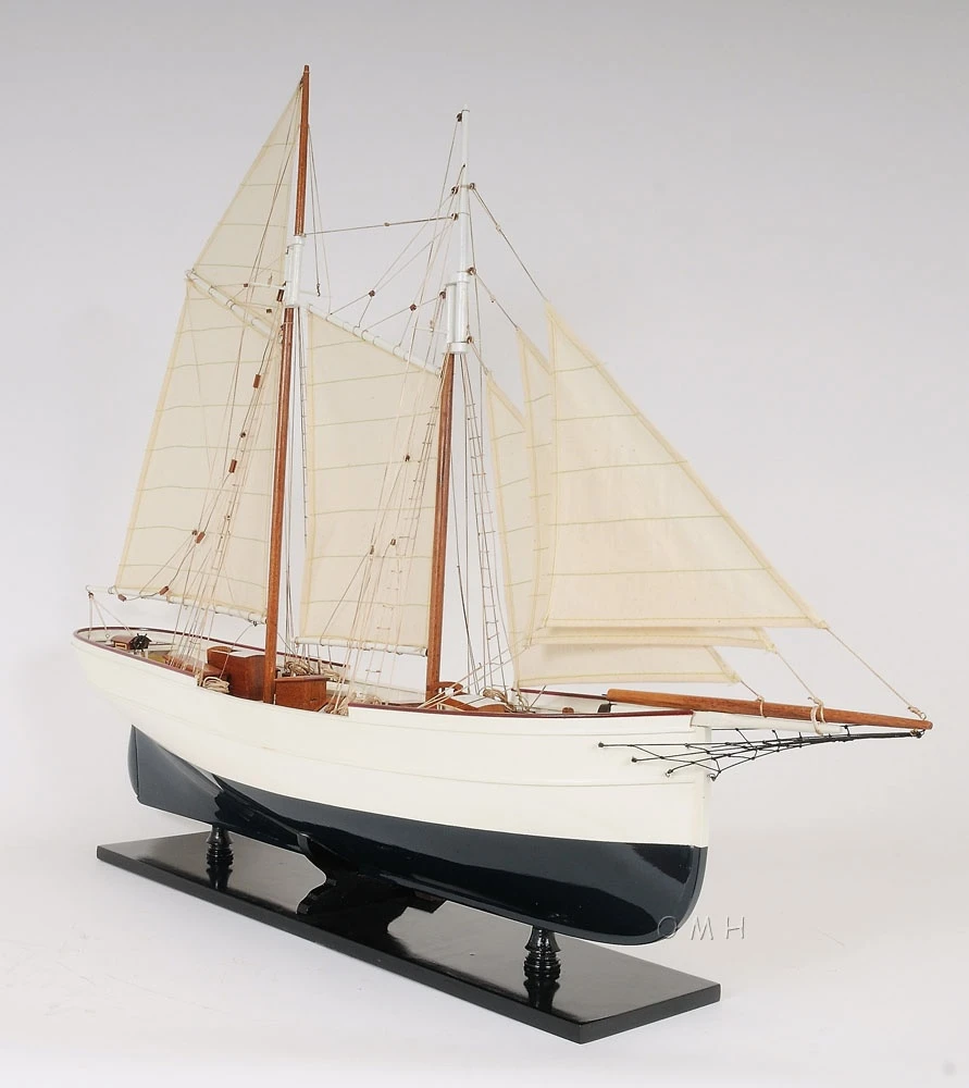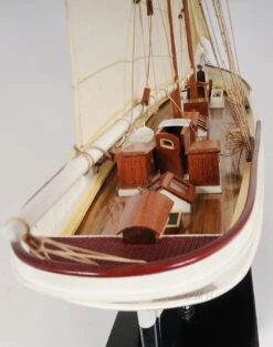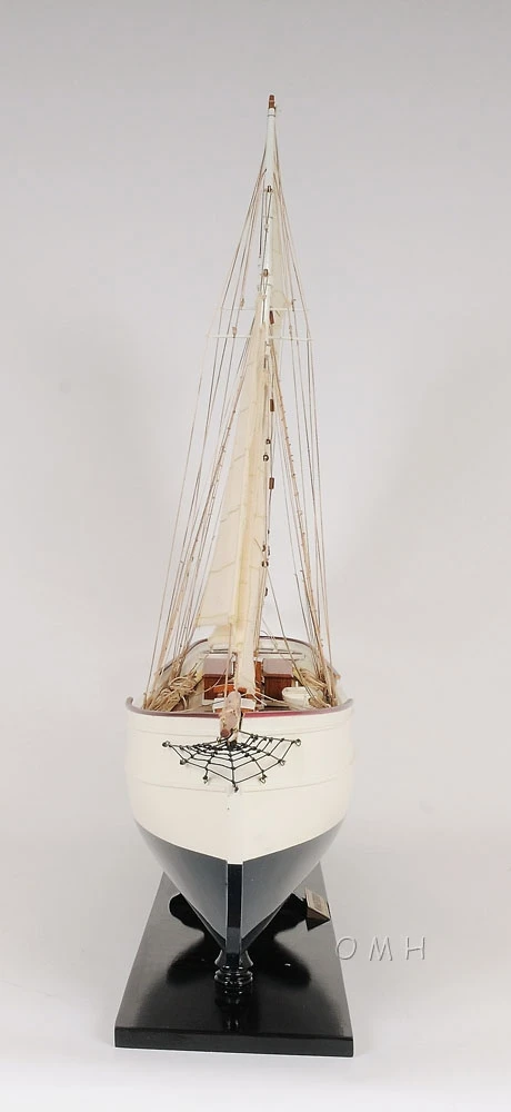 This is Museum-quality, Fully Assembled edition of the Wanderbird. The model is 100% hand built from scratch using “plank on frame” construction method. Our master craftsmen have spent more than 100 hours to finish it. Made of Mahogany and painted in white and very dark blue(closer to black). This replicas magnificent details include metal steering wheel, skylight, deck houses, advanced intricate rigging, full cloth sails with detail stitching, wood inlay deck and many more. Comes on a solid wood base, with metal nameplate.