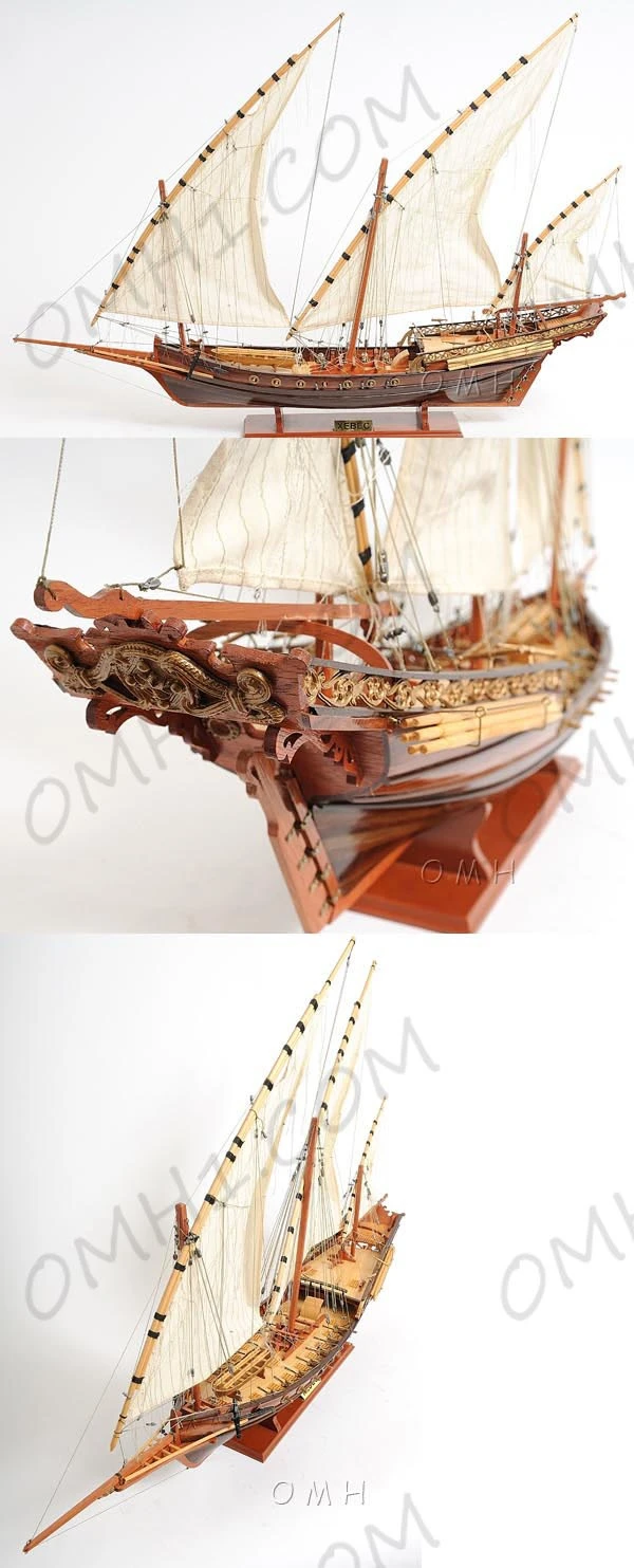 The Xebec was a widely used by Barbary pirates in the Mediterranean Sea. They are built for speed by having a narrower floor than most tall ships. It is available as a FULLY ASSEMBLED model ready to be proudly display as a piece of history. Master craftsmen handcraft these highly detailed wood models from scratch using historical photographs, drawings and original plan. They are built to scale with high-grade wood such as: western red cedar, rosewood, and mahogany. They are 100% hand built individually using plank-on-frame construction method and are similar to the building of actual ships. Each model requires hundreds of hours to finish and must go through a demanding quality control process before leaving the workshop. The Xebec has three masts with an elaborate display of riggings. There are gold coated metal cannons around the hull. The extended stern is the most eye capturing part of this model. There is an miniature wooden rowboat on the deck with oars. The elongated bowsprit of the Xebec makes it really stand out as a beautiful ship. You can find dozens of detailed sculpture and ornaments throughout the Xebec. This model come with an attached wood base with a brass nameplate. It’ll make a perfect gift for home or office decorator, boat enthusiast, or passionate collector.
